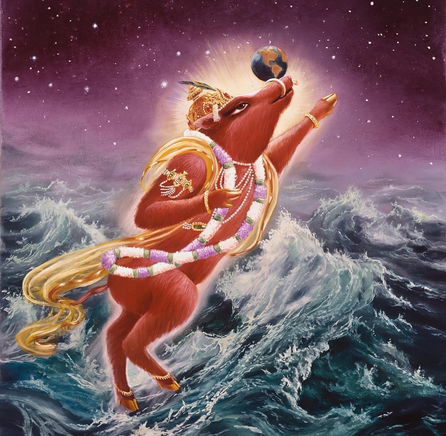 If we do the math, we can calculate that Brahma has been alive for more than 155 trillion years. In other words, Brahma chasing his daughter is a story that possibly happened many trillions of years ago. Taking this into consideration, it's not a surprise that the pastimes of the two appearances of Varāhadeva were condensed into just one.
