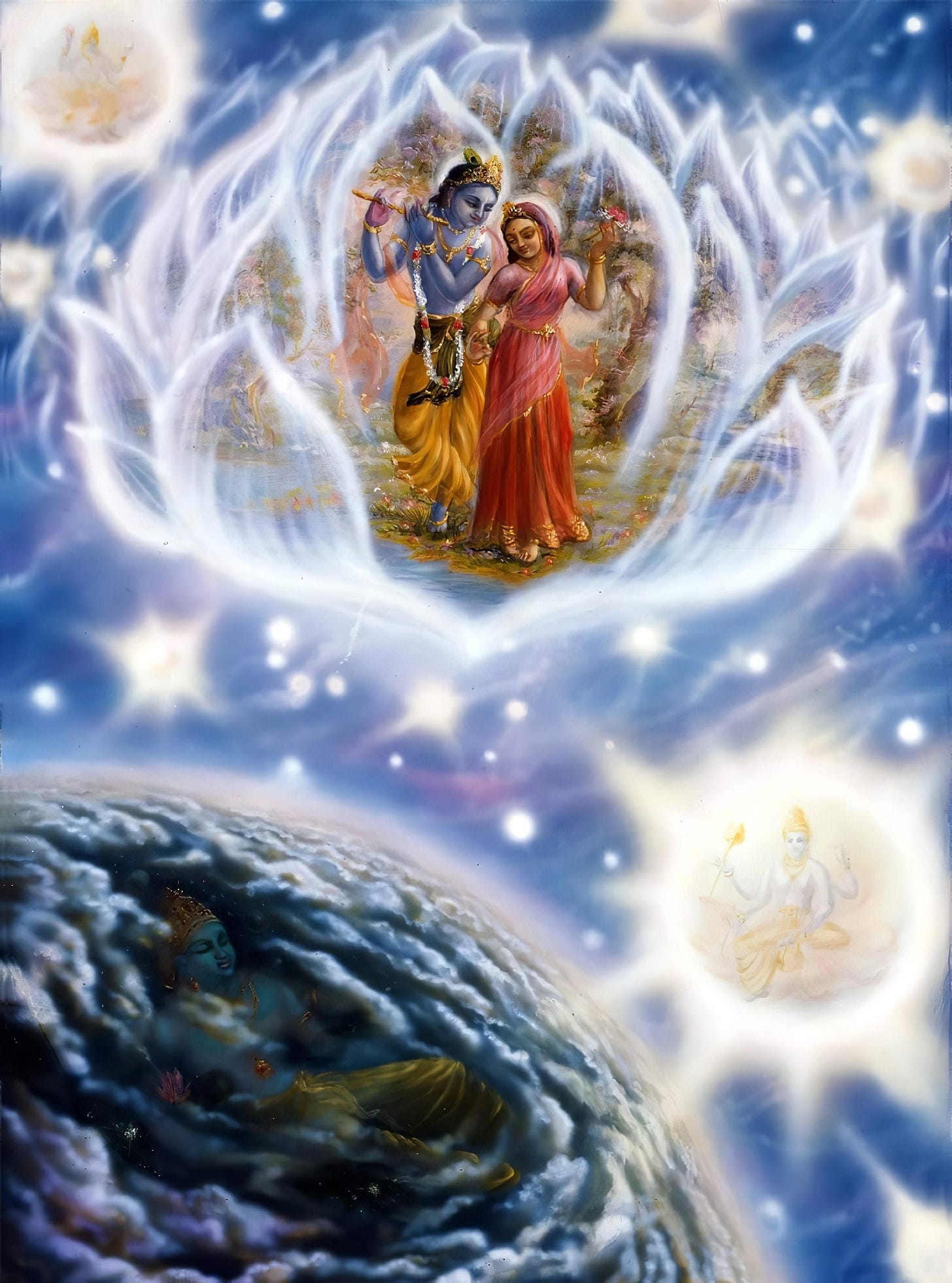 The center of the whole creation is Goloka Vrindavana, the inconceivably vast, lotus-shaped planet where the Lord performs His intimate pastimes surrounded by His perfect devotees. Goloka Vrindavana is bigger than all other spiritual planets combined; therefore, we can't even imagine how extensive it may be. Each of the petals of this gigantic Lotus is like a separate planet, where many pastimes happen simultaneously.