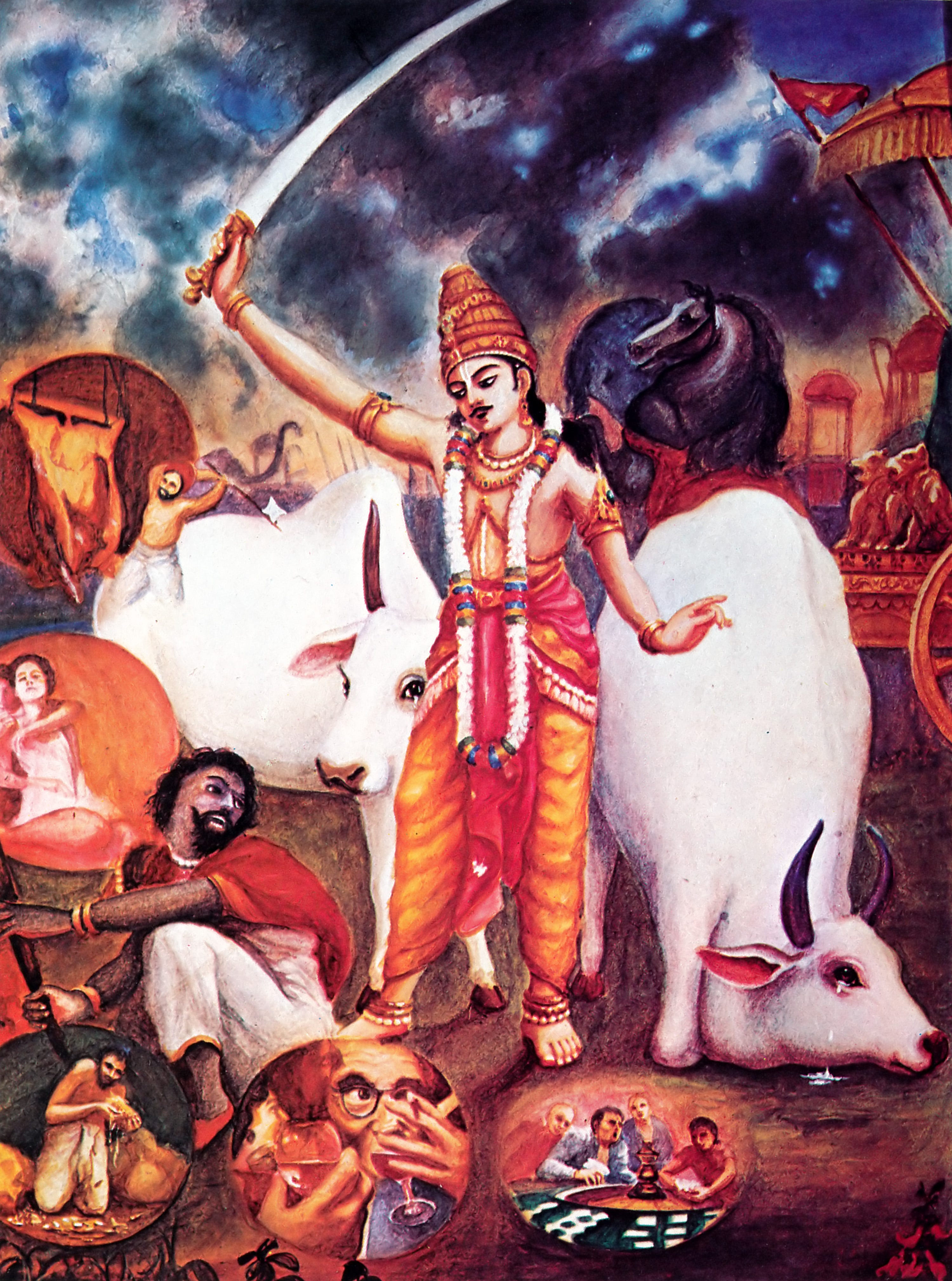 "O you, who are in the form of a bull! You know the truth of religion, and you are speaking according to the principle that the destination intended for the perpetrator of irreligious acts is also intended for one who identifies the perpetrator. You are no other than the personality of religion. Thus it is concluded that the Lord’s energies are inconceivable. No one can estimate them by mental speculation or by word jugglery." (SB 1.17.22-23)