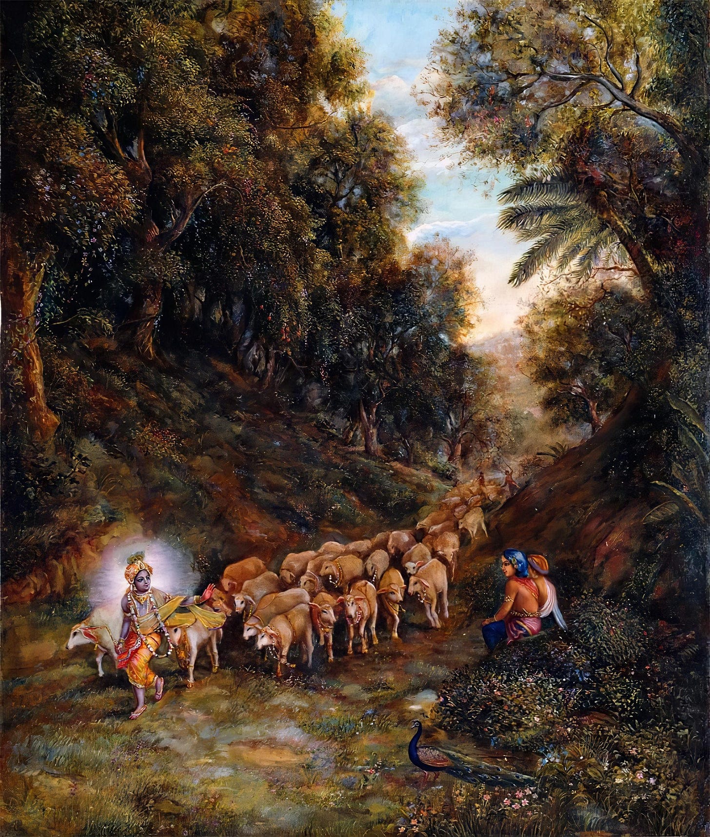 Hearing the cowherd women’s mixture of singing and crying, I could not determine by my own intelligence if their singing was due to feeling immense joy or if they were experiencing the most extreme sadness. As I looked around at that world, I thought for an instant that “I am in the material world.” But reflecting upon what I had seen before, I realized that I was present in Goloka, which is situated above the fourteen material worlds, the eight material coverings, and all other spiritual realms.