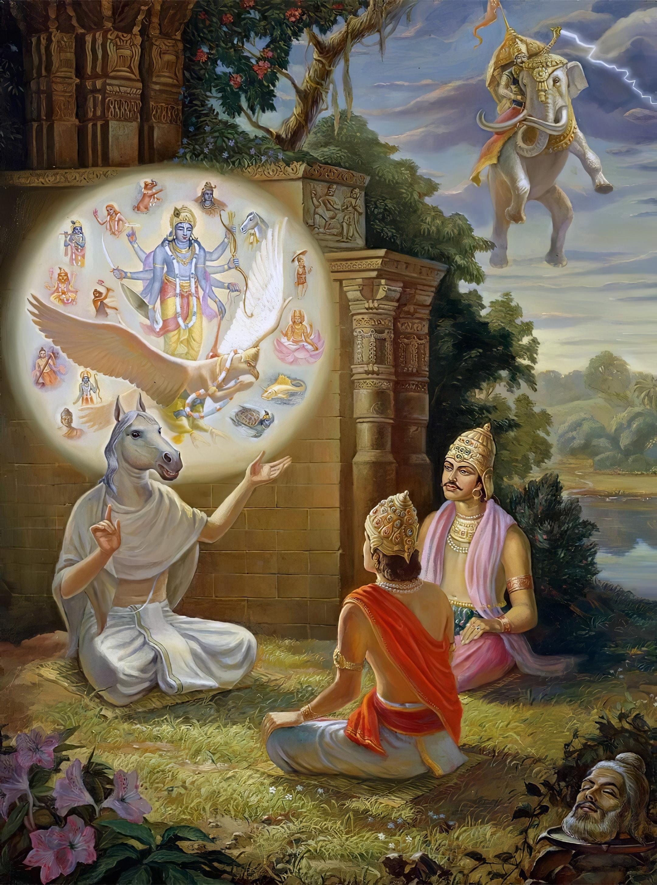 Sri Baladeva expands this argument by explaining that the uses of the locative and ablative cases in the two quotations do not present a contradiction. A parrot may be said to be “in” a tree or “on” the tree, and this does not make any real difference. It does not mean we are speaking about two different birds. In this way, the Lord may be said to the “in” or “on” the spiritual world, there is no real difference. There is thus no contradiction (avirodhāt); it just reinforces the point that He is everywhere.