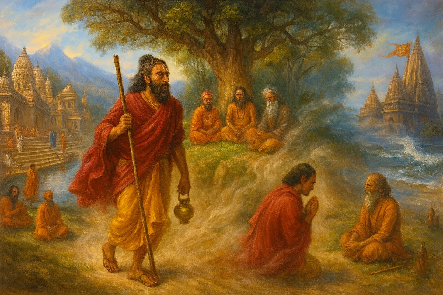 The strategy of Vidura worked. Drtarastra became convinced and immediately left the palace without telling anyone. Where did Drtarastra go? He went to the Himalayas, the shelter of all types of renounced sages who renounced the world. Even today there are still some yogis and sages living in the lower parts of the Himalayas, where the temperatures allow, but at those times it was much more common. It’s described that these sages would accept the difficulties with enthusiasm, just like Ksatriyas would become even more determined to fight after being struck by an enemy.