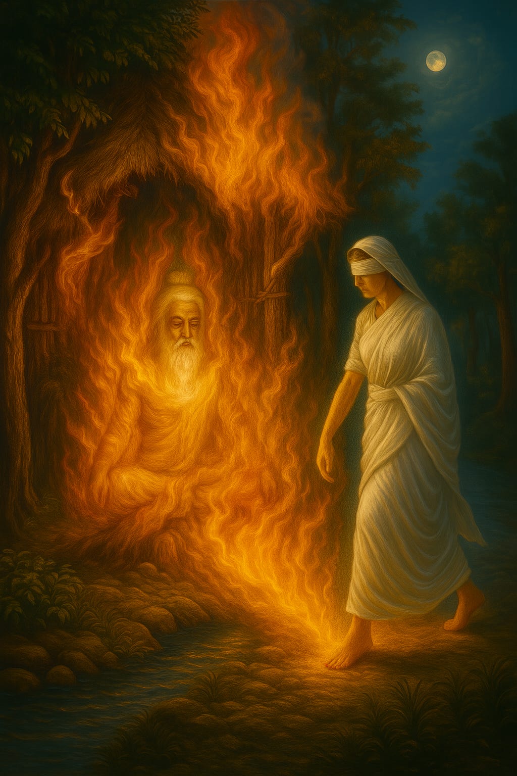 Although he was the oldest of the three brothers, Drtarastra was unfit to sit on the throne from the beginning, because he was blind. For a long time, he nourished the idea of making his son Duryodhana the king, and thus, he became implicated in all the intrigues made against the Pandavas. Now, after losing all his sons in the battle of Kuruksetra, he was being maintained by the Pandavas, whom he considered enemies and tried to kill so many times in the past. At this point, he was also very old and suffering from different health problems. Death was certainly close.