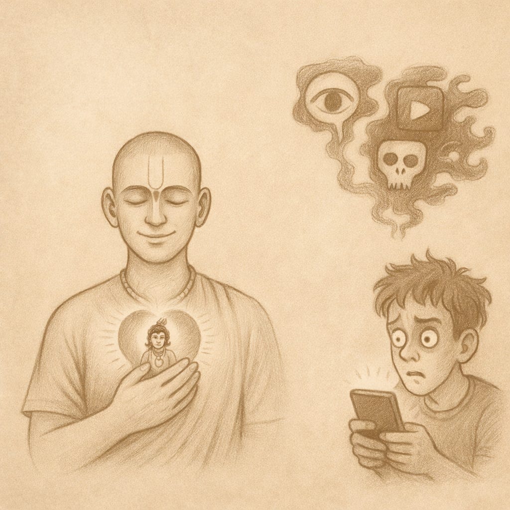 Similarly, all other types of information we receive influence the way we see the world. It influences our identity, our concept of reality, our desires, and so on. In the same way a person who spends all his time on social networks receiving all kinds of useless information will have his or her mind filled with all sorts of material desires and undesirable false identifications, someone who instead spends time hearing about Kṛṣṇa and associating with pure devotees will gradually start to identify with his original identity, will have his mind gradually filled with desires connected with service to Kṛṣṇa, and will be able to grow into this direction by using his purified intelligence.