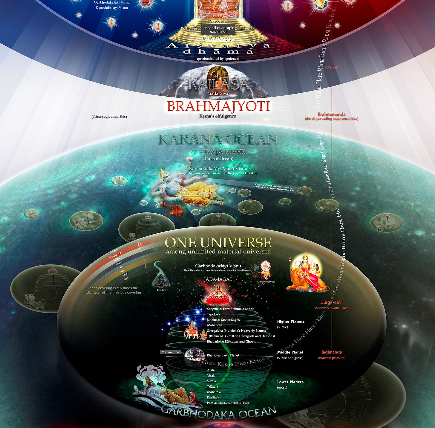 The first layer, composed of elemental earth, is ten times the diameter of the universe itself. The second layer, composed of elemental water, has ten times the diameter of the earth layer, and so on. After passing the first five coverings, composed of the five elements, one reaches the 6th covering, composed of mahat-tattva, the total material energy. After passing it, there is still the layer composed of false ego, the first and the subtlest of all material elements.