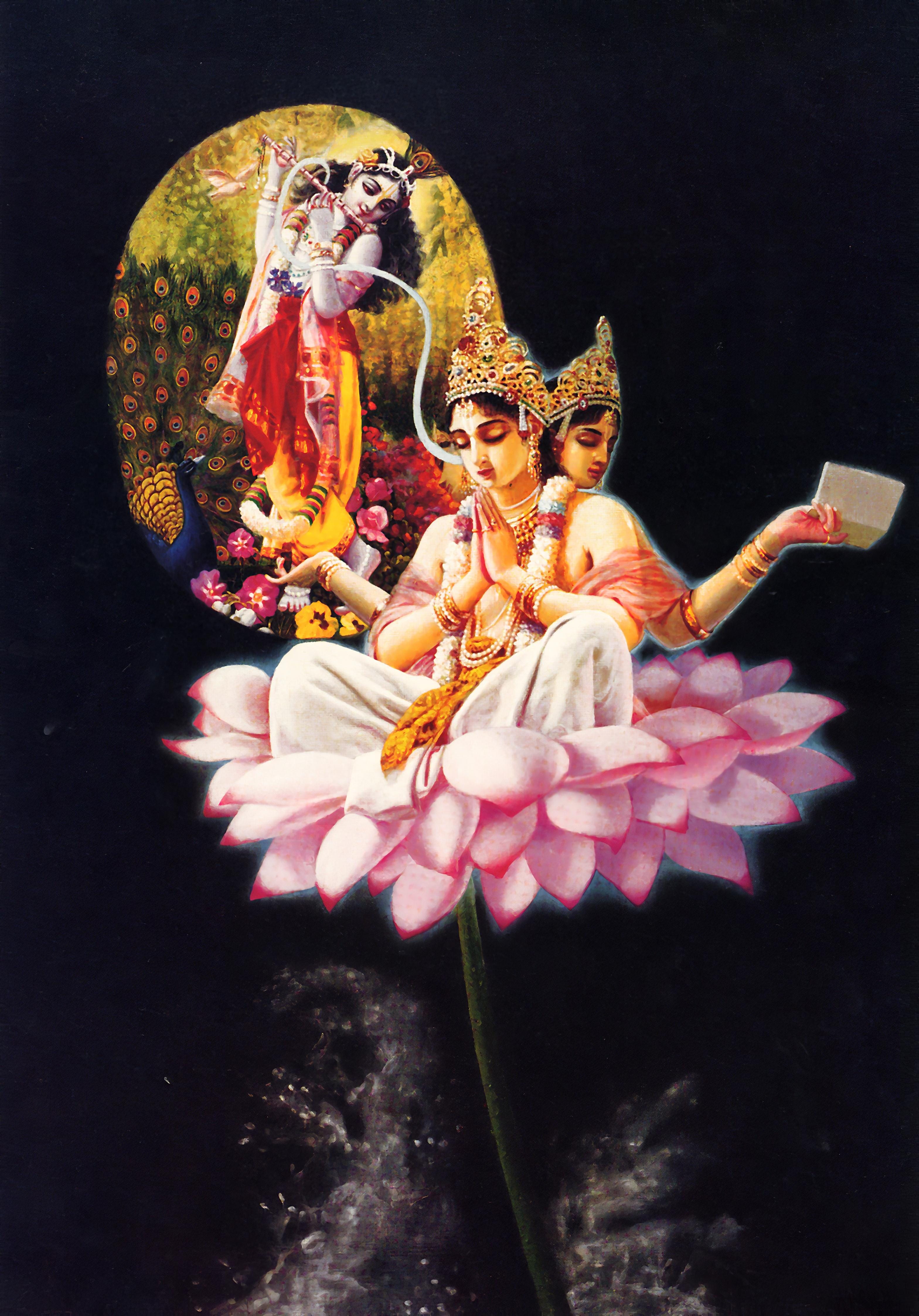 “The Lord was seated on His throne and was surrounded by different energies like the four, the sixteen, the five, and the six natural opulences, along with other insignificant energies of the temporary character. But He was the factual Supreme Lord, enjoying His own abode. Lord Brahmā, thus seeing the Personality of Godhead in His fullness, was overwhelmed with joy within his heart, and thus in full transcendental love and ecstasy, his eyes filled with tears of love. He thus bowed down before the Lord. That is the way of the highest perfection for the living being [paramahaṁsa]. And seeing Brahmā present before Him, the Lord accepted him as worthy to create living beings, to be controlled as He desired, and thus being much satisfied with him, the Lord shook hands with Brahmā and, slightly smiling, addressed him thus.” (SB 2.9.17-19)
