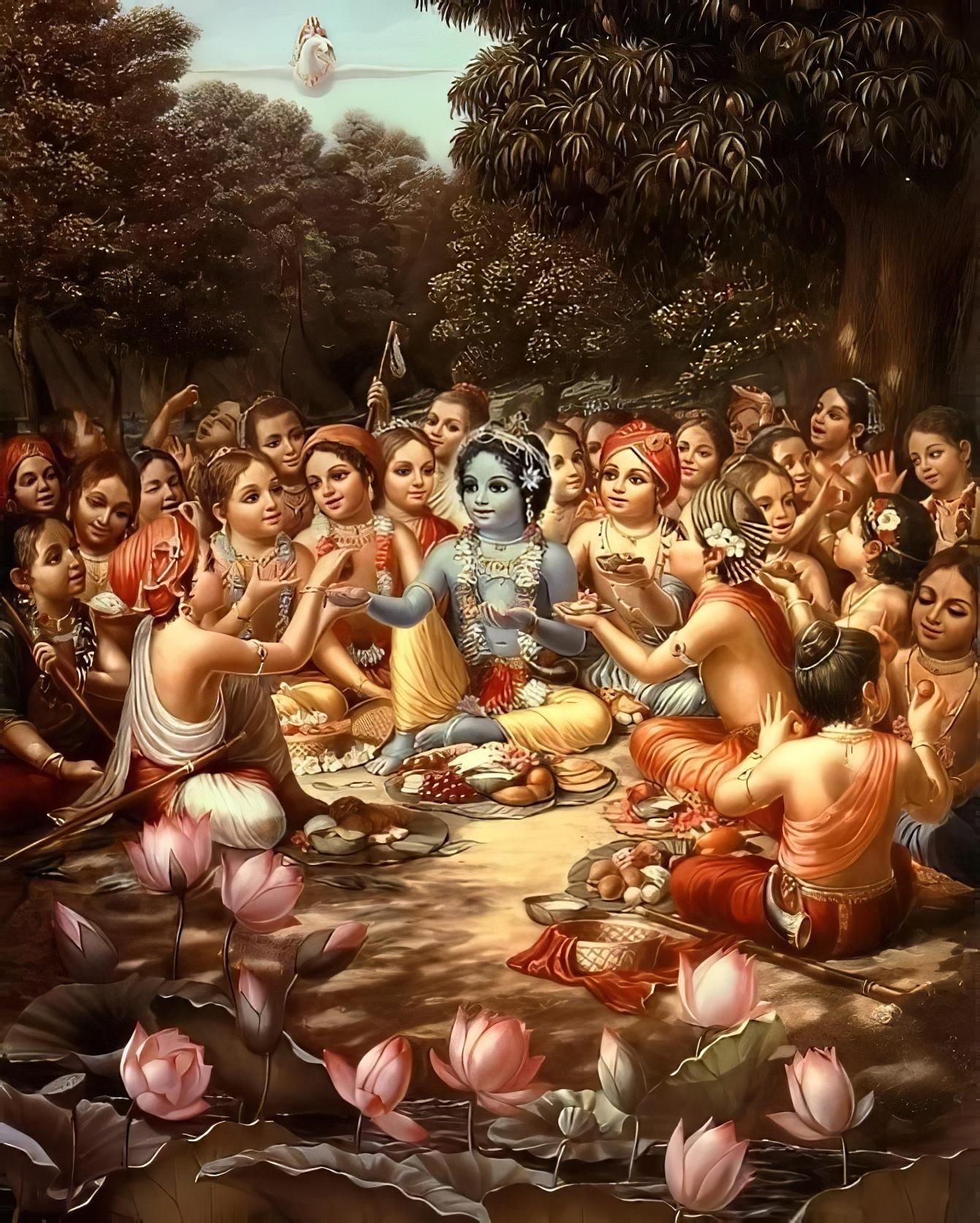Similarly, all the elderly Gopis had maternal affection for Krsna. Although they loved their own children, their feelings for Krsna were actually much stronger. Not only the elderly Gopis but also all the cows of Vṛndāvana desired to have Krsna as their son. Although Krsna reciprocates this desire by taking their milk and butter, as well as reciprocating in other ways, He doesn't have the opportunity of directly living in their houses and accepting their service. However, due to the actions of Brahma, Krsna was able to expand Himself and simultaneously become the child of all the mothers of Vṛndāvana for a whole year. Thanks to this wonderful service, Krsna had the opportunity to increase the affection of His devotees for Him.